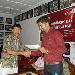 Mr. Shashi Sharma Majgainya was honored by the top five lyricists in the Music Khabar Music Award in 2012. He received the certificate for being one of the best lyricists from Senior Singer and Film Director Mr. Narayan Rayamajhi in Kathmandu.
