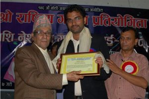 “Shashi Sharma Majgainya was honored with a recognition certificate by esteemed Nepali literary figures Rastra Kavi Madhav Prasad Ghimire and the legendary poet Dr. Krishnaraj DC during a prestigious ceremony in Kathmandu. This recognition came following his establishment of the National Gajal Award on behalf of Rapati Samaj Kathmandu in 2011, as well as the release of his book of ghazals and songs, titled ‘ShashibhitrakaShashiharu,’ in the same year.”